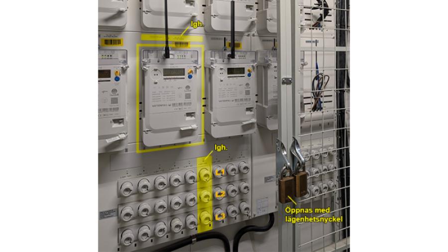 - Kontrollera vilken är din mätare och vilka tre proppar som tillhör genom att kontrollera lägenhetsnumret (se bild)